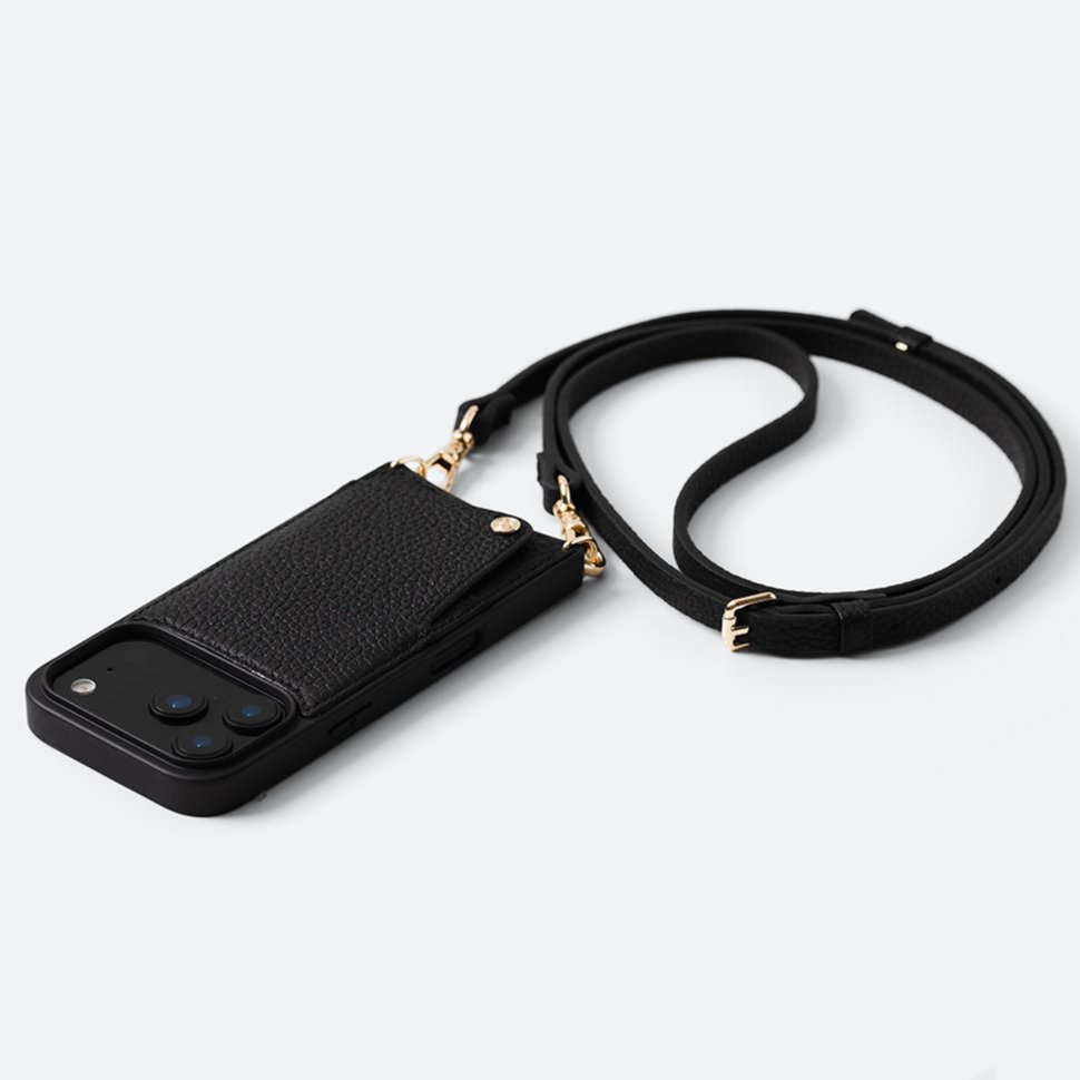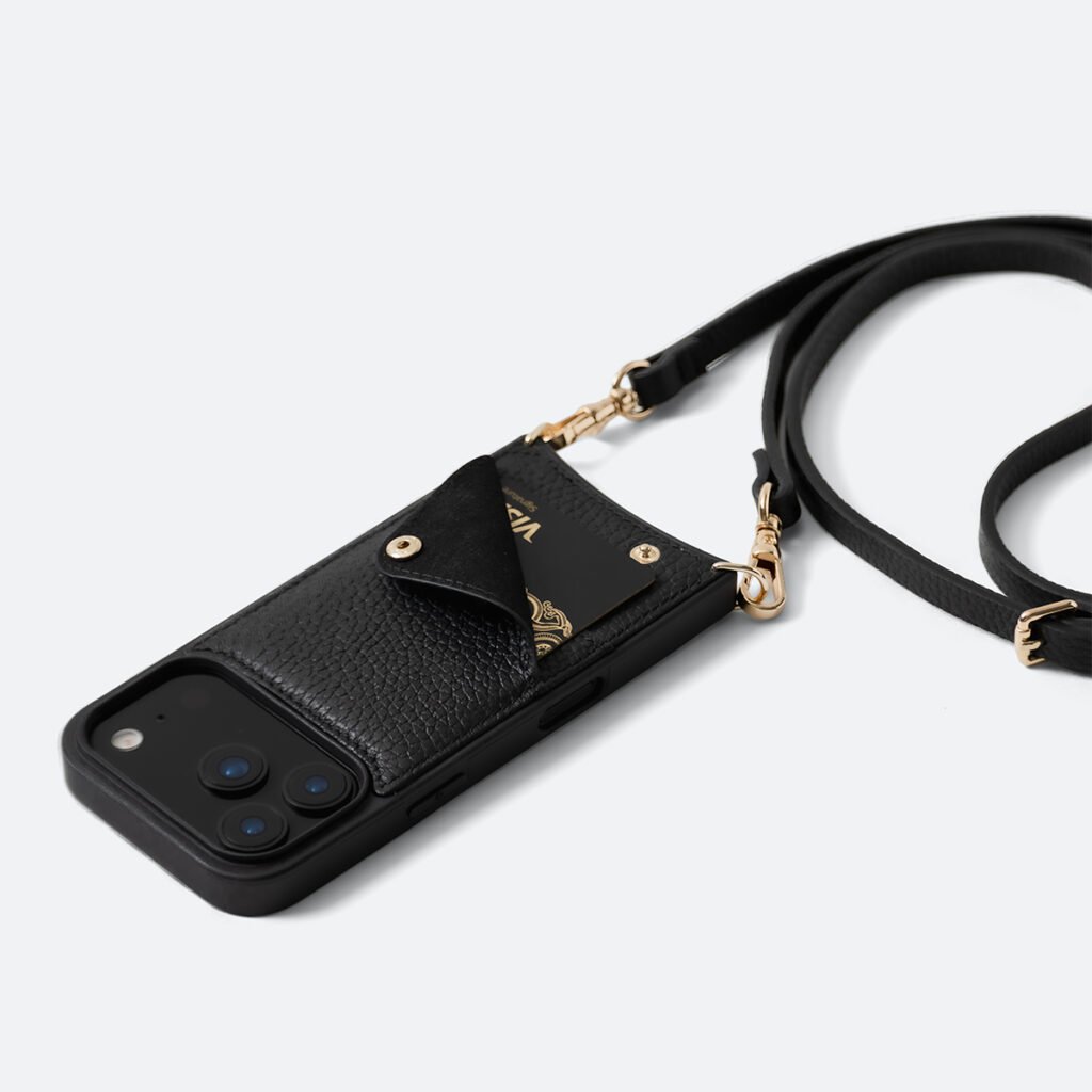 The Aria Elegant Strap Crossbody Slim Design iPhone Wallet is a timeless masterpiece, embodying both sophistication and minimalist charm. Meticulously crafted from genuine black pebble leather and adorned with subtle gold-tone accents, this wallet seamlessly blends style with functionality.
