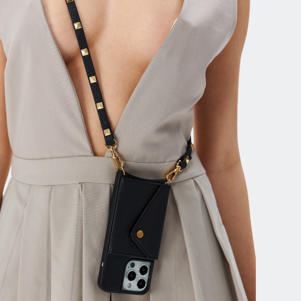 • Deluxe Pyramid-Studded Strap: Premium 48″ crossbody with a lustrous gold-tone buckle. Features a seamless detach for stand-alone phone case use.