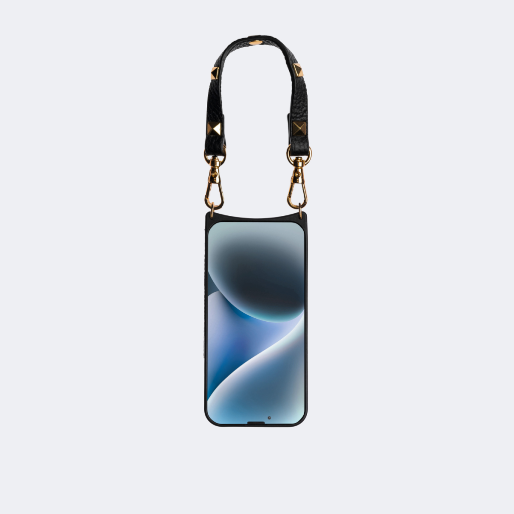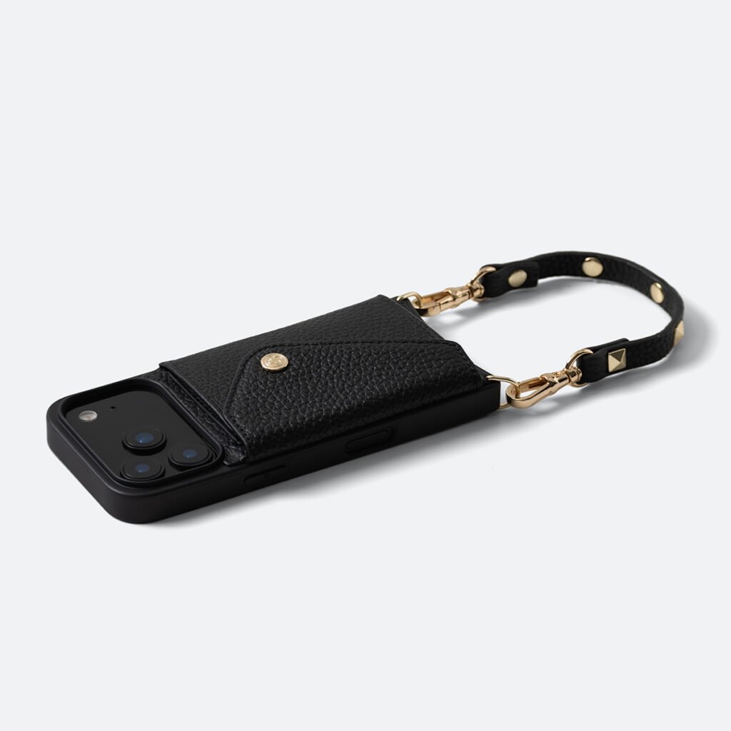 The Betty wrislet is crafted from genuine, high-quality pebble leather. This versatile accessory boasts a detachable leather wristlet strap adorned with eye-catching pyramid studs, offering a chic alternative to the shoulder strap.