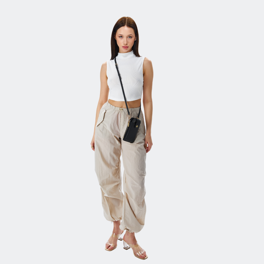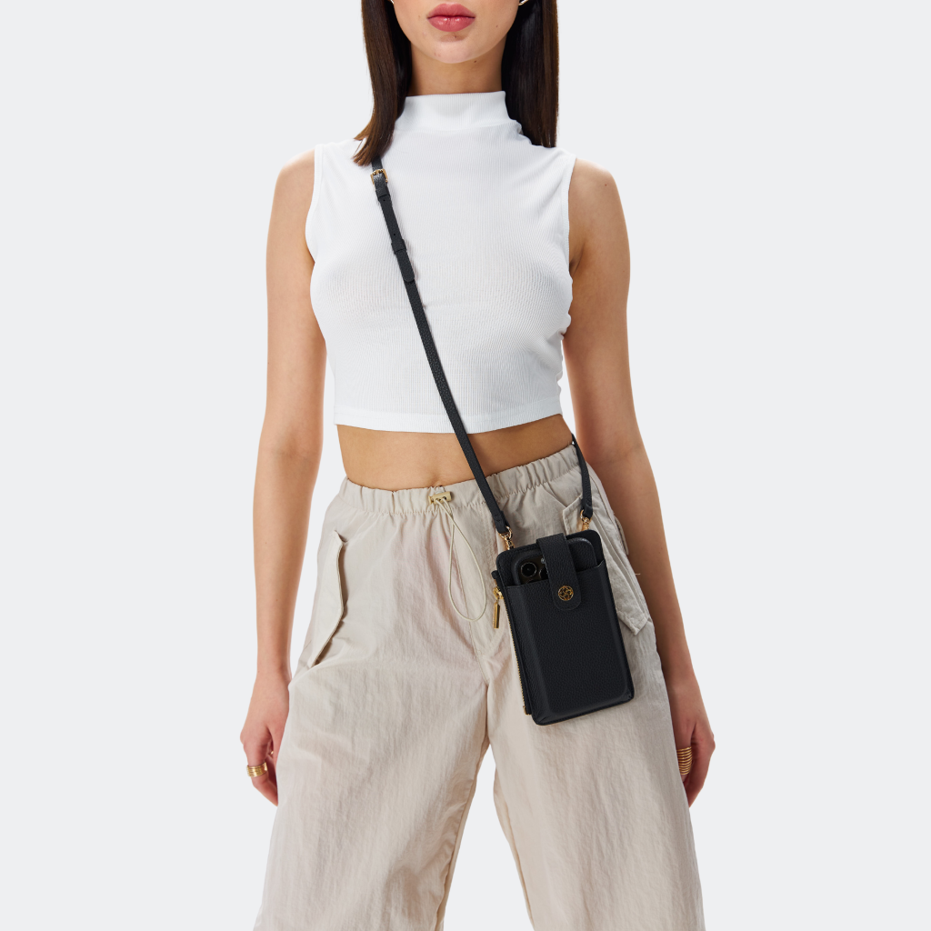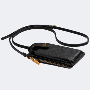 The Borsa Tracolla, the embodiment of Italian elegance and practicality.This crossbody phone bag, meticulously crafted from luxurious black pebbled leather, accommodates any phone size and small items.With a handy card slot on the back and a zippered wallet that can house your passport, it’s a minimalist accessory that marries style and function seamlessly.