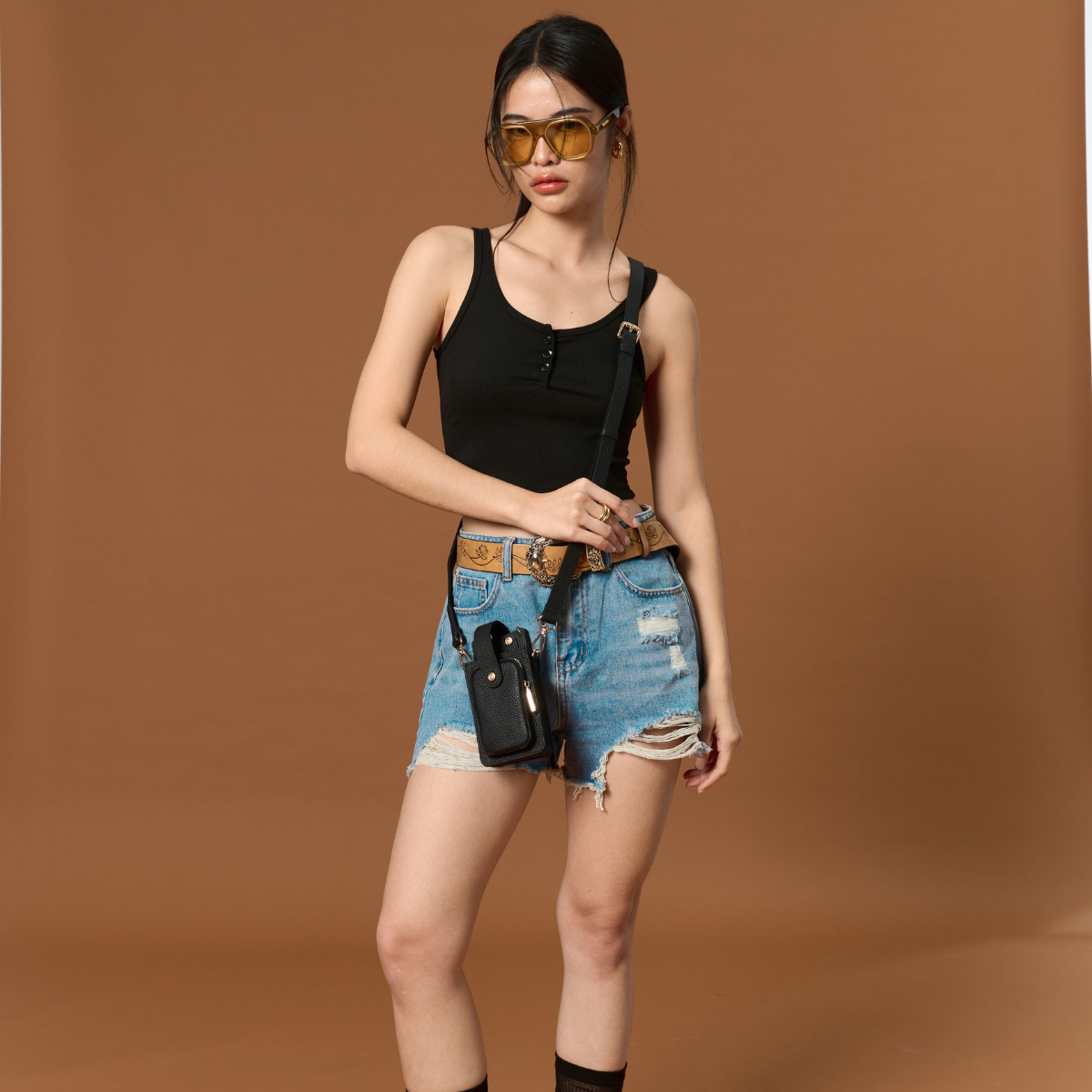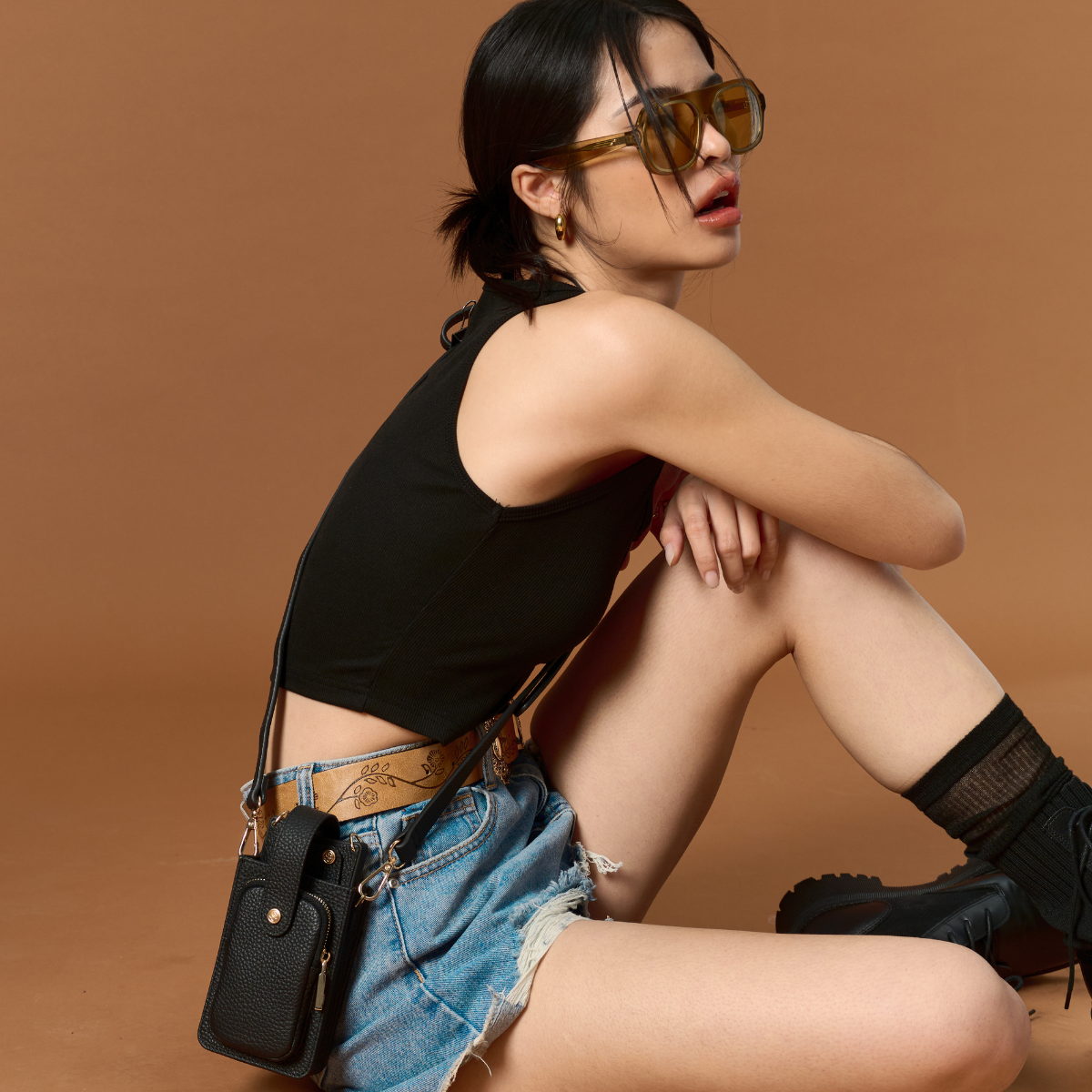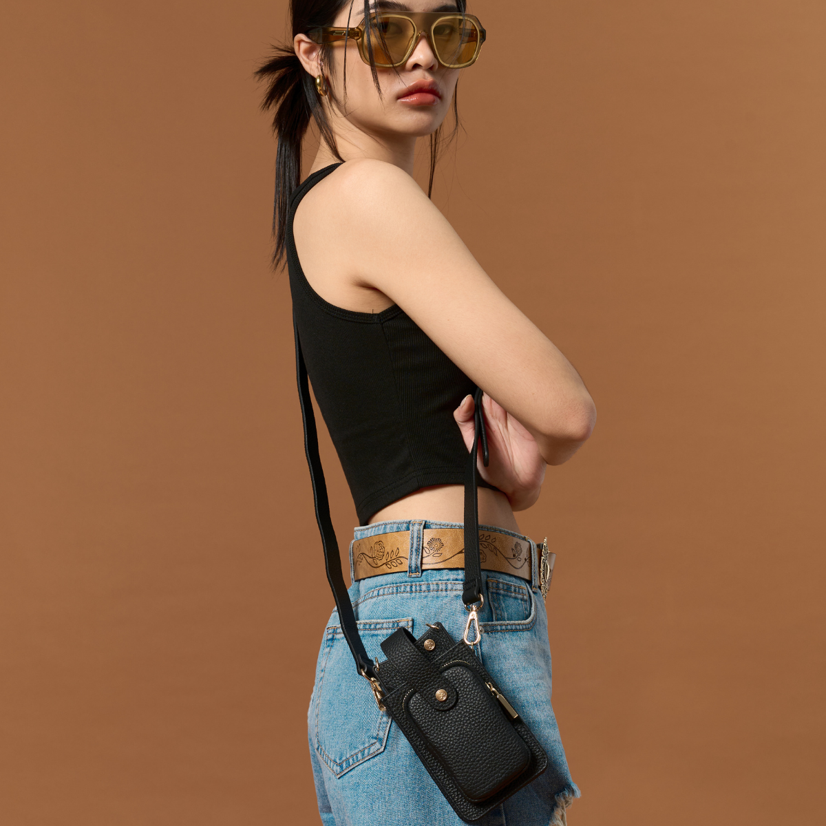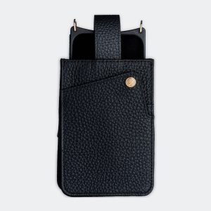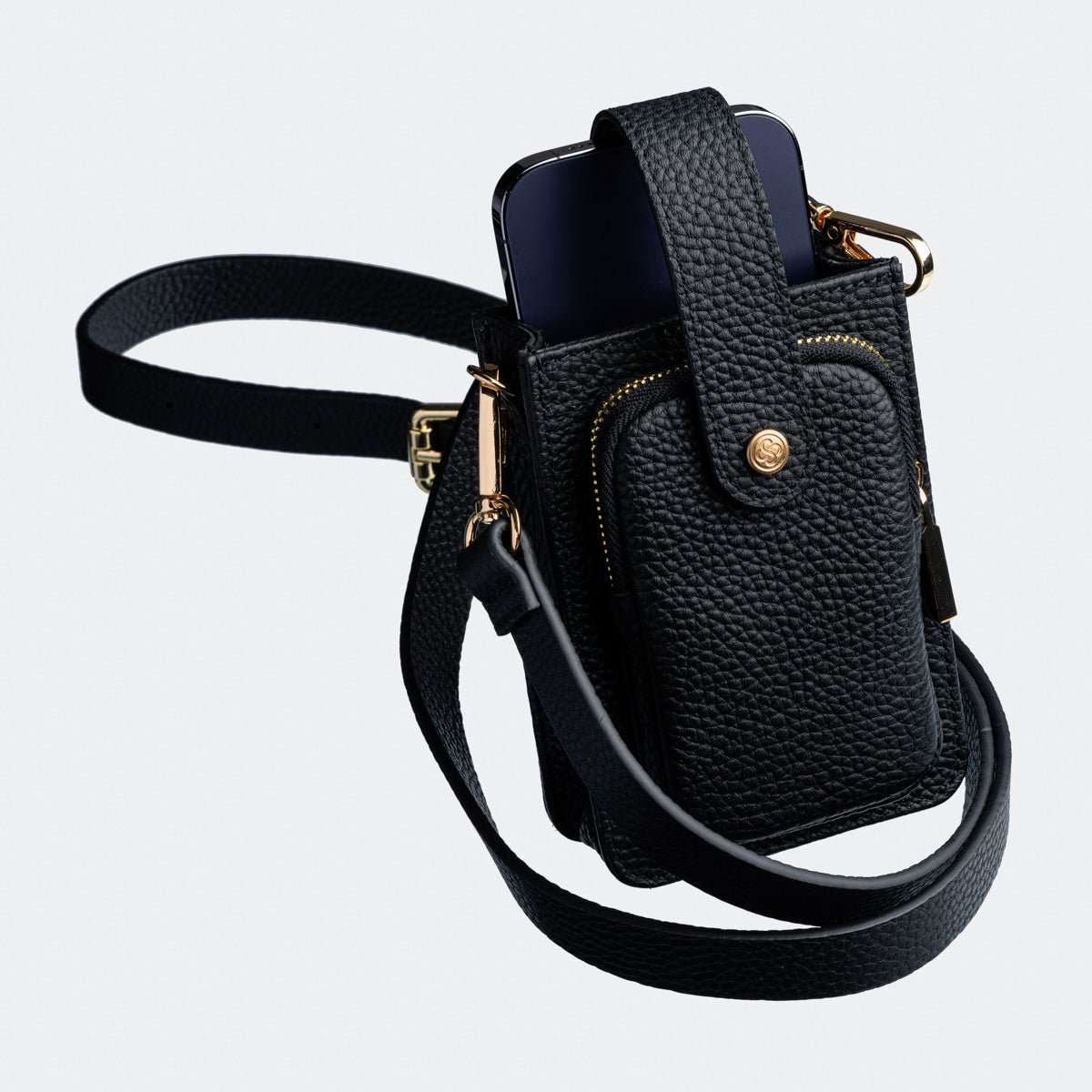 The  Piccola, crafted from luxurious black pebbled leather, features a convenient phone pocket for easy access, allowing you to securely store your everyday essentials. Ideal for both daily use and special events, this compact bag boasts a zip closure and a sleek vertical design. Its distinctive style adds a captivating allure, making it the perfect complement to any outfit while safely holding your essentials.