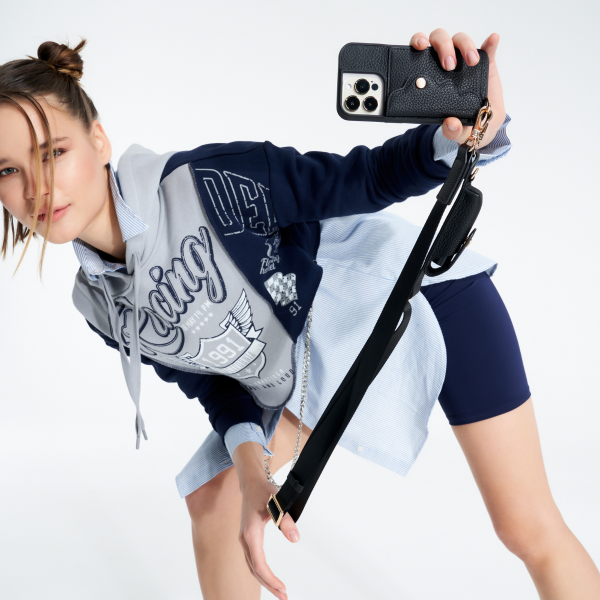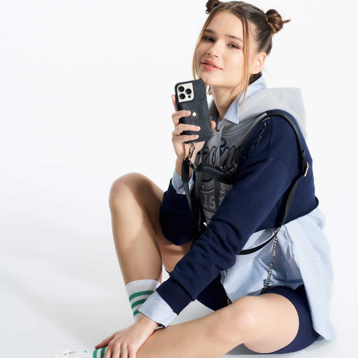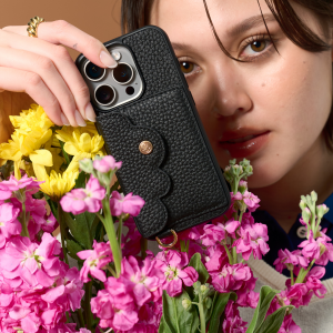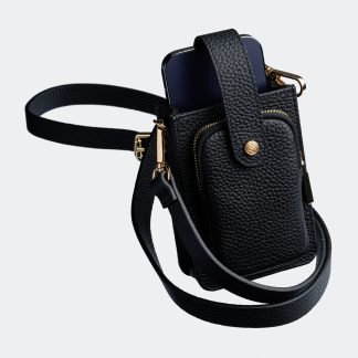 Gabrielle, a luxurious phone case wallet, is crafted from high-quality pebble leather, offering durability with a unique texture. This elegant design features a compact pouch for your phone, a sturdy single D-ring for added utility, a detachable keyring, and a custom AirPod case. Perfect for those who value sophistication and practicality in a sleek, multi functional accessory