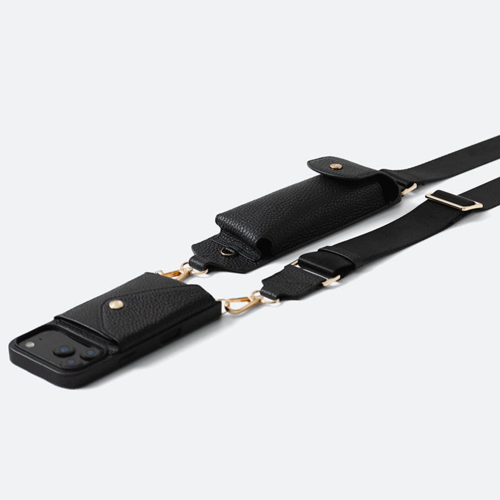 The Giulia Sunglass Pouch features a sleek gold-tone buckle for an exquisite touch. The strap seamlessly detaches for standalone use with your phone case, offering both style and versatility.