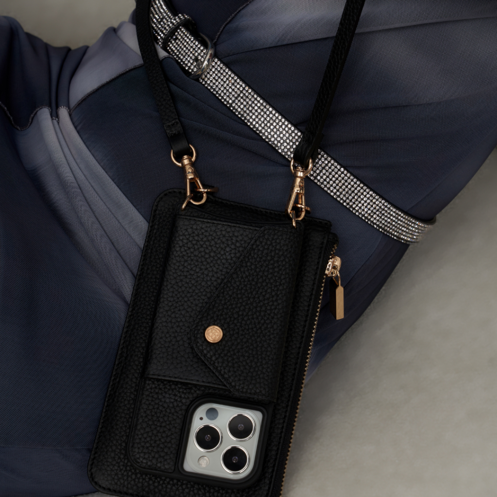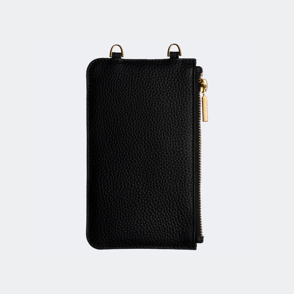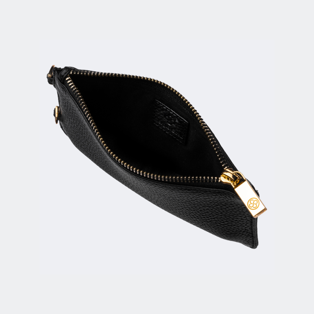 The Pochette, where spaciousness meets minimalist elegance. This chic accessory showcases a modern D-ring element paired with a secure zipper finish. Delicately crafted from authentic black pebble leather and adorned with gold-tone embellishments, it’s more than just a pouch. With room for everything from cards and cash to makeup and other slim items, it seamlessly transitions from a detachable accessory to a standalone clutch.